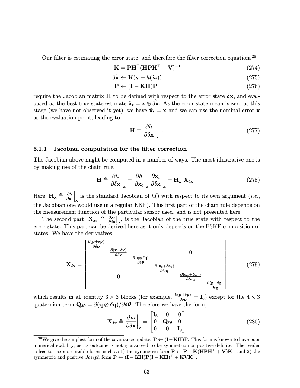 Derived complete Jacobian matrices for both prediction and update steps, enabling accurate covariance propagation through nonlinear system dynamics. Applied the Joseph form for covariance updates to guarantee positive semi-definiteness, while implementing multiplicative quaternion error injection to maintain unit norm constraints throughout the estimation cycle.